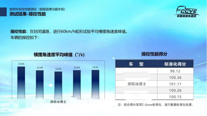 此次“5A級冷藏車”認證包含了對車輛的動力性能、制動性能、經濟性能、駕乘舒適和溫度控制共5項一級指標以及細分的9項二級指標在內的詳細評價。測試中,冷鏈1號·帥鈴冰博士冷藏車在60km/h剎停項目中以18.13米的優異成績在五款主流F類冷藏車中名列前茅,制動性能行業第一;在60km/h蛇形試驗中,帥鈴冰博士冷藏車平均橫擺角速度峰值最佳,以101.11的高分穩居第一。