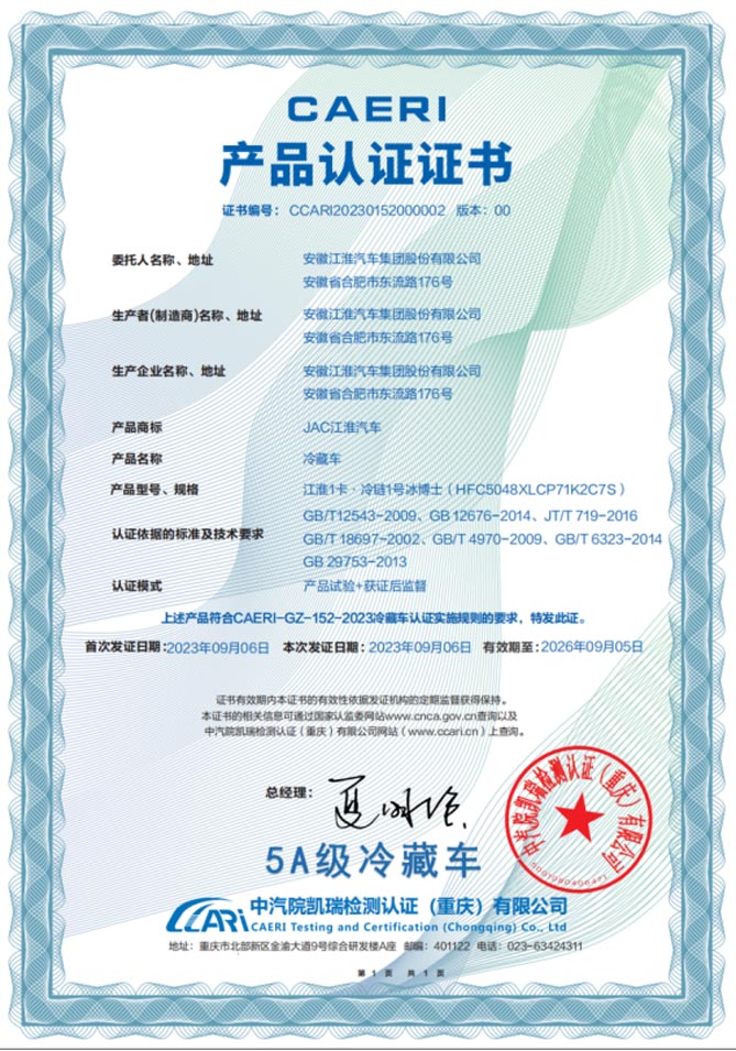此次江淮1卡冷鏈1號·帥鈴冰博士冷藏車獲得中汽院“5A級冷藏車”產品認證,是行業權威機構對其優秀產品力的高度認可。今后,帥鈴冰博士冷藏車將繼續發揮優秀的產品優勢和貼心的服務優勢,精準洞察冷鏈運輸細分市場用車需求,以更高端的專業冷藏車為用戶創造更高運營價值,為冷鏈運輸行業注入發展新動能。