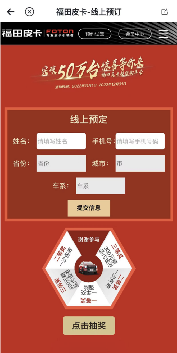 福田皮卡突破50萬臺超值購車季,超多重磅福利大回饋,即日起在線訂車即可享受驚喜好禮,下載APP即刻體驗(yàn)吧!