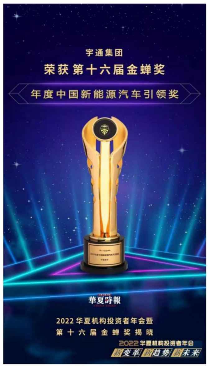 2023年1月6日,由《華夏時(shí)報(bào)》主辦的“新變革 新趨勢(shì) 新未來(lái)——2022 華夏機(jī)構(gòu)投資者年會(huì)暨第十六屆金蟬獎(jiǎng)”揭曉,宇通集團(tuán)榮獲“2022年度中國(guó)新能源汽車(chē)引領(lǐng)獎(jiǎng)”。
