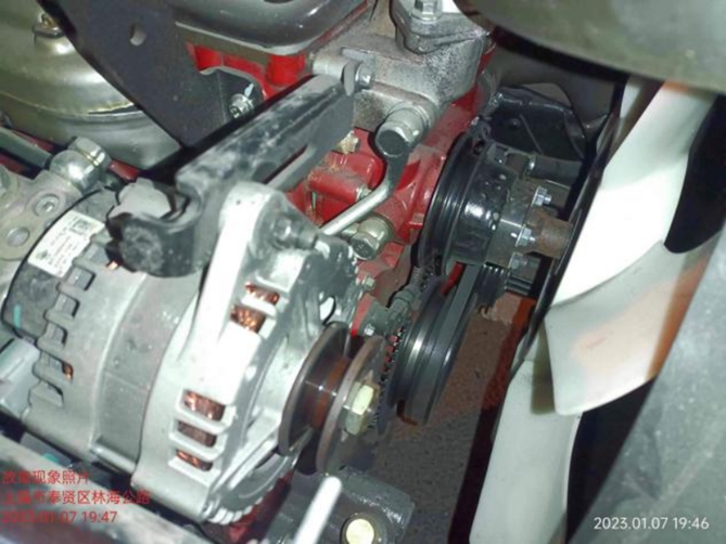 江淮1卡上海奧獅服務站與樊老板取得聯系后,通過電話詢問故障表現,初步判斷了故障原因,攜帶好相關配件與工具后立即駕車出發。20分鐘后,維修人員到達樊老板所在報修點,經檢查后發現,發電機風扇皮帶脫落導致水溫異常。看到這里,樊老板這才想起來跑上一趟運輸的時候車輛已經在報警了,因為趕著送貨,一著急就忘記檢查了,這才出現發動機高溫報警。