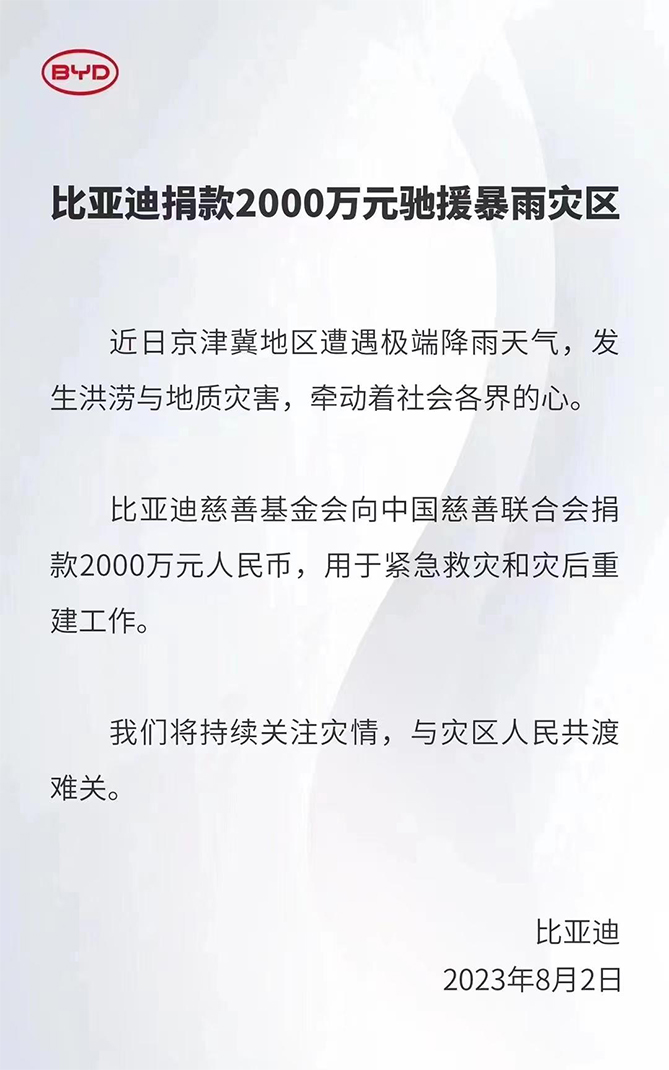 比亞迪向京津冀暴雨災區捐款2000萬元
