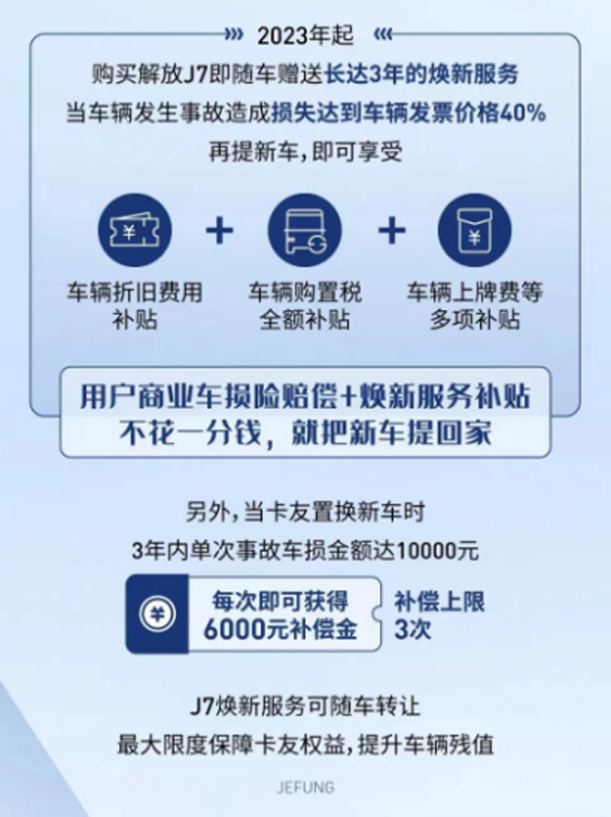 一方面,一汽解放以硬核實力持續產品升級;另一方面,以感動服務持續為卡友運營保駕護航!自2020年起,一汽解放便為每輛J7車免費贈送了一份長達3年的專屬“煥新”服務,目的就是保障J7用戶在遇到車損交通事故情況下,能將損失降到最低。三年來,這項政策幫助眾多卡友在交通事故之后“不花一分錢,新車提回家”,讓卡友重燃生活的勇氣,做卡車司機最堅實的后盾。