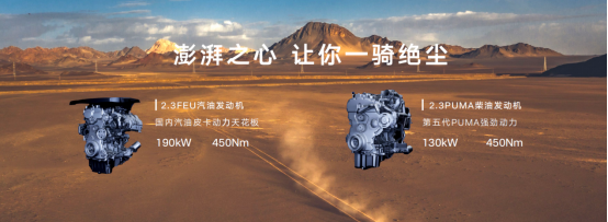 敢探者提供2.3T FEU汽油發(fā)動(dòng)機(jī)和第五代2.3T PUMA柴油發(fā)動(dòng)機(jī)兩種動(dòng)力選擇,汽油發(fā)動(dòng)機(jī)峰值功扭190千瓦/450牛米,柴油發(fā)動(dòng)機(jī)峰值功扭130千瓦/450牛米,動(dòng)力性能強(qiáng)勁。
