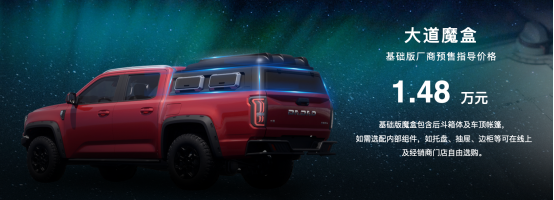 在本屆成都車展,大道魔盒也正式開(kāi)啟預(yù)售,并將在10月起陸續(xù)交付,敢探者、追光者均可選配。魔盒基礎(chǔ)版廠家預(yù)售指導(dǎo)價(jià)格為1.48萬(wàn)元(包含后斗箱體及車頂帳篷,如需選配內(nèi)部組件,如托盤、抽屜、邊柜等可在線上及經(jīng)銷商門店自由選購(gòu))。