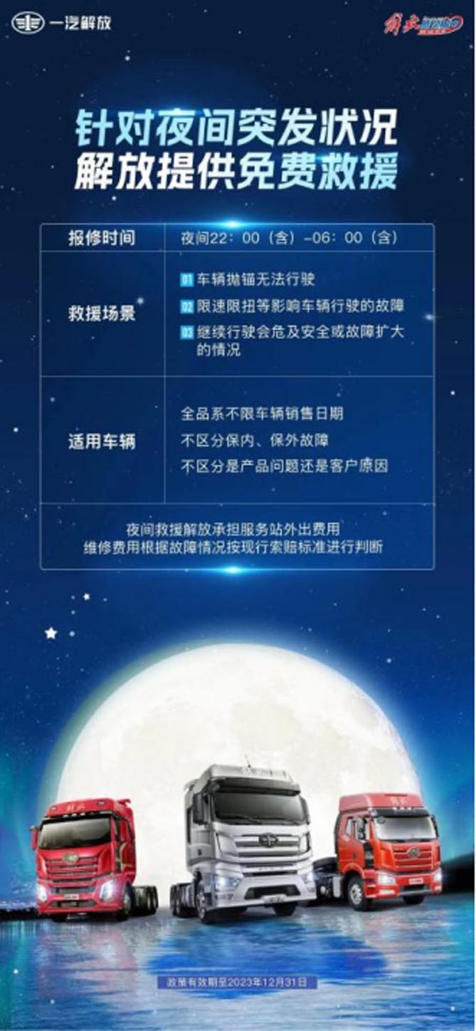 不久前,一汽解放針對夜間突發狀況推出免費救援服務。該政策適用于解放全品系車型,不限車輛銷售日期;不區分保內、保外故障;不區分是產品問題還是客戶原因。一汽解放不怕晚,不嫌遠,提供夜間免費救援!解放承擔服務站外出費用,維修費用根據故障情況按現行索賠標準進行判斷。