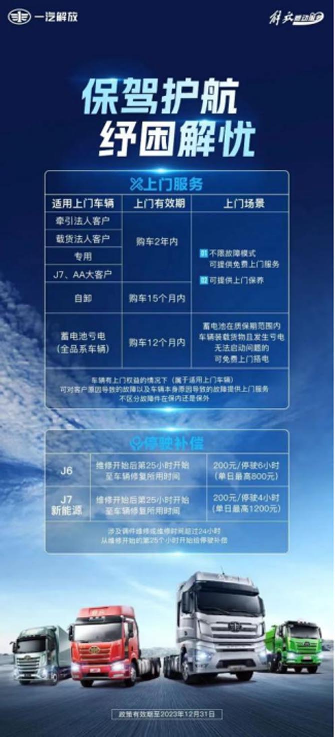 為了打造行業最優的服務體系,2023年,一汽解放在售后服務領域打出一套“組合拳”,先后重磅推出:J7車主專享的五大權益;NG發動機、CNG發動機超長質保政策;2023年自卸車輛專項服務政策;車輛“夜間突發狀況免費救援”以及“上門維保、停駛補償”等各類精細化服務,更精準、更及時、更有效地幫助用戶解決運營難題。在新政策的加持下,讓解放用戶真正感受到品質與價值的雙重保障,這不僅體現了一汽解放對用戶權益的高度重視,更為行業樹立起全新服務標桿。