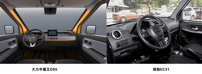 內(nèi)飾方面,瑞馳EC31采用黑色飾板,點綴銀色飾板裝飾,整體色調(diào)略偏暗沉,黑色編織座椅可以雙向調(diào)節(jié);杯托設(shè)計在換擋機構(gòu)前方,方便拿取的同時,占用了駕駛空間。反觀大力牛魔王D05內(nèi)飾簡約時尚,采用科技感的紋理設(shè)計,搭配雙智能屏,配合跳色點綴,更顯科技活潑。此外,大力牛魔王D05還配備了主副駕雙杯托、7大儲物空間、四向調(diào)節(jié)座椅、歇腳板等人性設(shè)計,領(lǐng)先同級車型,讓駕乘更舒適。