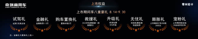 首發上市的奇瑞零米,售價14.48萬元起。9月30日前享受上市八重豪禮,即:試駕禮、金融禮、購車置換禮、救援禮、升級禮、無憂禮、膨脹禮和寵粉禮。