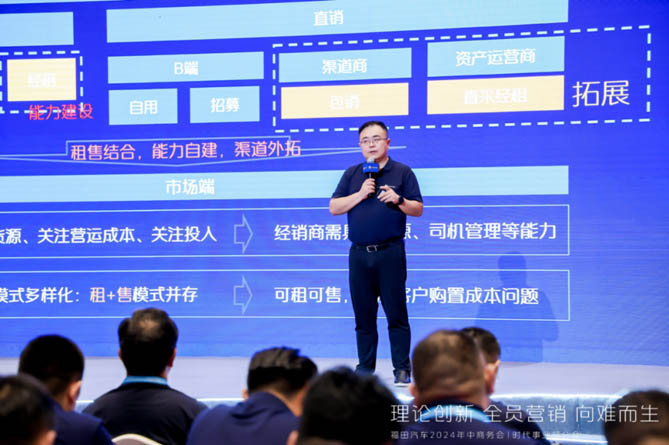 面對新能源的快速發展和商業模式的變革,時代事業部積極擁抱變化,深化轉型升級。會上,福田汽車集團時代事業部營銷副總裁劉剛在《務實創新 攜手共贏》的營銷工作報告中指出,時代事業部上半年存在微車業務占有率波動性下滑,營銷體系存在短板,領航業務穩健發展,但業務結構仍不均衡等一系列問題,面對這樣的問題劉剛給出了解決方案,他表示,在內卷的行情中,我們要健康穩健的生存下去,必須建立前市場+后市場相結合的客戶全生命周期管理模式。從簡化商務政策設計,調整星級評價,推進促銷線上化,到高價高促轉為低價低促,再到給經銷商伙伴減負,將改變做到實處,解決痛處。變革的速度至關重要,不僅僅是對產品或服務的簡單調整,更是涉及到運營模式及企業文化等多方面的全面革新。我們需要主動出擊,而不是被動應對。