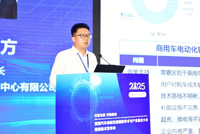 中國汽車技術研究中心有限公司新能源汽車研究部部長朱一方在會上作了《新能源重卡領域重點政策動態》報告。以市場滲透率、競爭格局、降碳緊迫性等問題切入,分析重卡電動化形勢,對商用車促消費、運營車輛達標管理、公共領域電動化、燃料電池示范、充換電基礎設施建設、智能網聯汽車監管、安全隱患排查等政策進行解讀和研判,并結合發展形勢和政策環境對重卡企業提出發展建議。