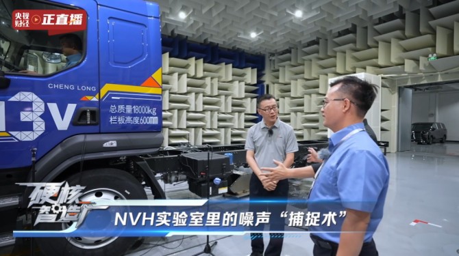 在NVH實驗室,消聲室的墻體采用雙層隔聲結構,內壁、頂部鋪設吸聲尖劈,可以將99%以上的聲波反射消除,背景噪聲可低至17分貝。在這里,工程師們通過噪聲源定位、傳遞路徑分析、響應分析等試驗技術,對車輛進行“診斷”和優化。例如,乘龍M3燃油車怠速噪聲大概在52分貝,相當于家里洗衣機工作的音量;時速80公里行駛時,車內噪聲在64分貝以下,可以媲美乘用車SUV的靜音水平。