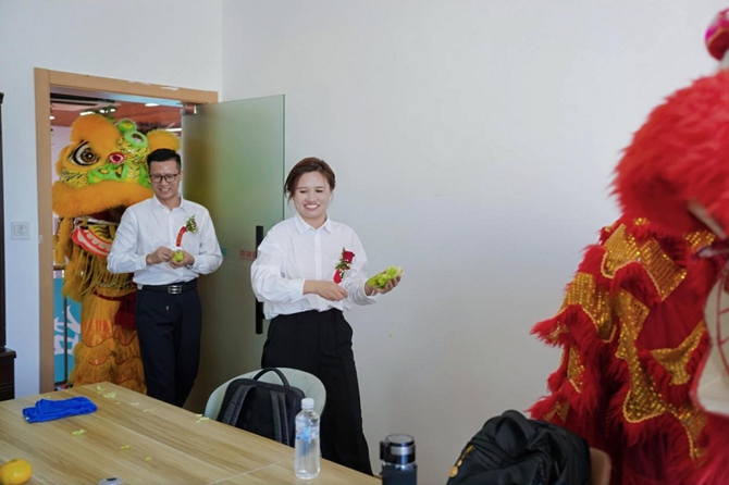 點睛禮成,祥獅覺醒!伴隨激昂的鼓點,兩頭威武雄獅昂首騰躍,直奔店面門頭的 “青陣”—— 青翠的生菜高懸其間,寓意 “生財有道、吉祥如意”。只見雄獅時而騰挪跳躍,時而俯身探爪,動作剛勁有力又不失靈動俏皮,引得現場掌聲不斷。最終,雄獅精準銜取生菜遞向江文波先生與黃小琴女士,并將生菜灑下溫州盛通好用旗艦體驗中心的角角落落,象征將好運與財富灑滿門店,也寓意著溫州盛通好用旗艦體驗中心未來生意興隆、財源廣進。