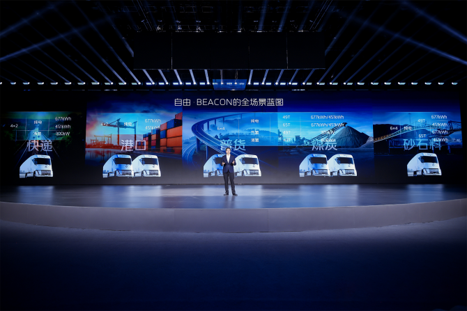 以福田卡文重卡BEACON為例,基于獨(dú)創(chuàng)的一體化平臺,獨(dú)創(chuàng)跨平臺、可拓展、高集成的動(dòng)力底盤一體化架構(gòu),實(shí)現(xiàn)氫電共平臺與高集成承載。