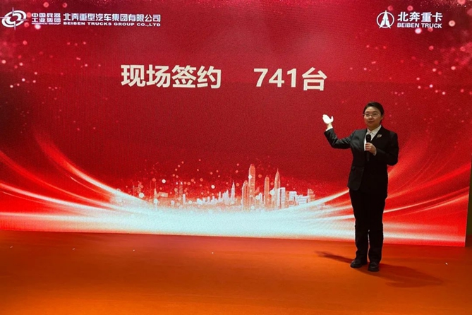商務晚宴期間,馮艷萍宣讀《北奔重汽2023年度華東大區商務年會現場簽單政策》,經銷商踴躍參與,實現現場簽約741臺!