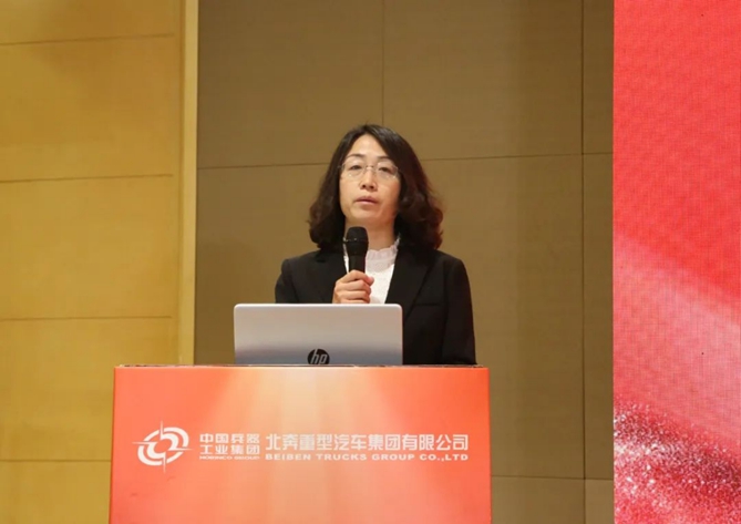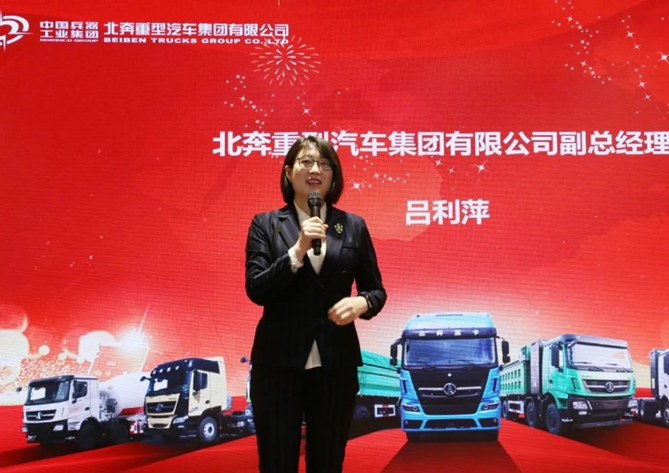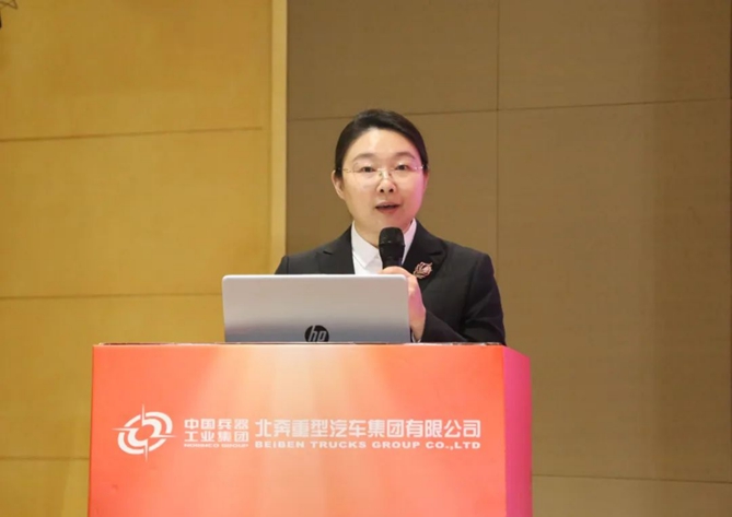 呂利萍以《共識北奔品牌 共建價值體系》為主題報告,講述了北奔的故事。報告指出,北奔重汽始終堅持傳承人民兵工的紅色基因,秉承奔馳技術的藍色血液,承載綠色發展的核心使命。北奔重汽出生偉大,使命光榮,先后四次參加閱兵,七次參與神州系列飛船搜索任務,彰顯實力擔當。四次作為國家代表,參加國際軍事比武項目,斬獲多項榮譽。北奔重汽作為國內從生產線到工藝、到技術圖紙全套德國基因的研產銷一體化發展的重卡制造企業。近年來積極踐行國家雙碳戰略,堅持“政府培育、政策支撐,市場主導,產品支撐,場景先行,產業鏈協同,低碳綠色、包您滿意”的工作方針,打造“綠色低碳物流運輸方案解決商”。作為行業首家集成新能源重卡生態鏈、產業鏈、供應鏈、金融鏈企業,成為地方推動國家雙碳戰略的綠色發展主角、綠色運輸主力、綠色產業鏈長。2023年,希望與各方合作伙伴攜手共進,相互扶持,創贏未來。