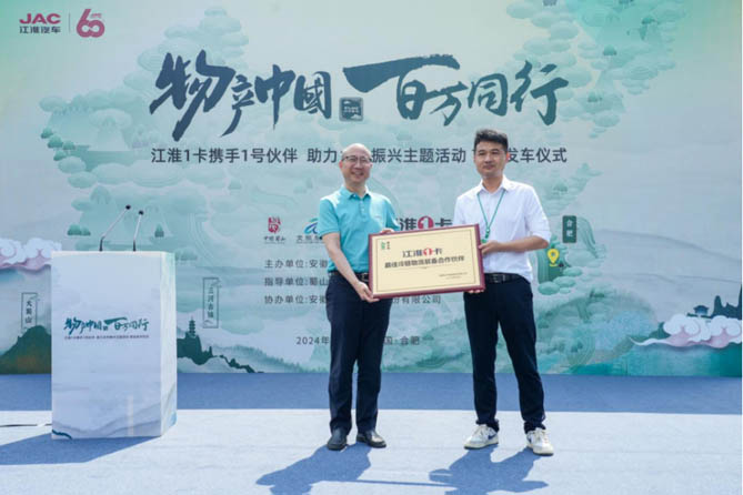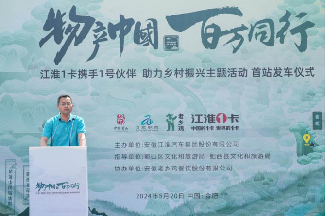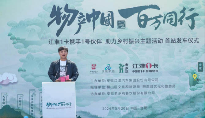 2024年5月20日,江汽集團迎來建廠60周年紀念日。甲子JAC,1卡獻禮!江淮1卡“物產中國 百萬同行”活動安徽站首站發車儀式在安徽省合肥市老鄉雞中央廚房舉行。活動現場,安徽省合肥市蜀山區文化和旅游局、安徽省合肥市肥西縣文化和旅游局、安徽著名餐飲品牌老鄉雞、江淮1卡,以及來自全國各地的江淮1卡榮耀1號伙伴、媒體朋友們齊聚一堂,共同講述“國家地理標志保護產品——老鄉雞”的故事,助力鄉村振興。