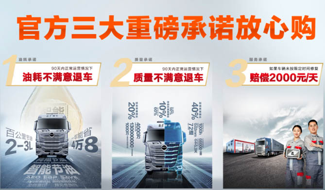 另外產品投放市場后,性能品質的自信與首批用戶的好評反饋,讓北京重卡有了扎實的底氣,率先在行業推出針對質量、油耗及服務的3大承諾:不滿意就退車,修不好按天賠,北京重卡以2個“后悔藥”與1顆“定心丸”,有效消除用戶對新產品質量、油耗、服務方面的顧慮。敢第一個在承諾領域大膽“吃螃蟹”,足可見北京重卡對產品品質及整車運營性能的自信,也體現了其讓利客戶,為用戶創造更多價值的決心。
