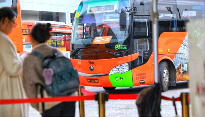 (赴澳旅客排隊乘坐宇通新能源旅游客車)