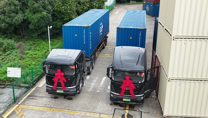 同時,上海虹口區發改委、虹口區生態局、上海市電力公司、三峽上海院電力規劃院、上海環境能源交易所相關領導及代表參加活動,并通過視頻連線,共同見證首批 “零碳車隊”發車儀式。 “雙碳”目標下,新能源集裝箱卡車作為綠色物流的核心裝備,其規模化應用已成為交通領域減排的必然選擇。比亞迪作為全球唯一一家同時掌握電池、電機、電控、芯片及整車技術的新能源汽車企業,在商用車特別是電動重卡領域,布局早、技術硬、市場經驗豐富,已在港口物流、商品物流、建筑物流等細分場景進行大規模商業化運營。 本次試運營的比亞迪純電動重卡Q3,為565度長續航版和382度短續航版,車輛搭載自研刀片電池、輪邊驅動系統和高集成電控等核心技術,通過高安全、響應快、效率高等優勢,與E電充的智慧能源交通互聯網高效對接,滿足港口重載運輸與城市配送需求,實現物流車輛與電網的能量雙向流動管理。 目前比亞迪重卡已投入洛杉磯港口、寧波大榭港等場景運行,以“三電統一”、更快反應、更高效率、更優適配等高效連接車輛與港口、物流區的智能作業系統,實現云端平臺監控、車輛調度、自動駕駛等常規操作,不僅有效提高運輸效率,也降低了人力成本。 今后,比亞迪將繼續攜手更多合作伙伴,以更優品質的新能源車輛與整體解決方案,助力港口運輸、城配物流的綠色低碳發展。