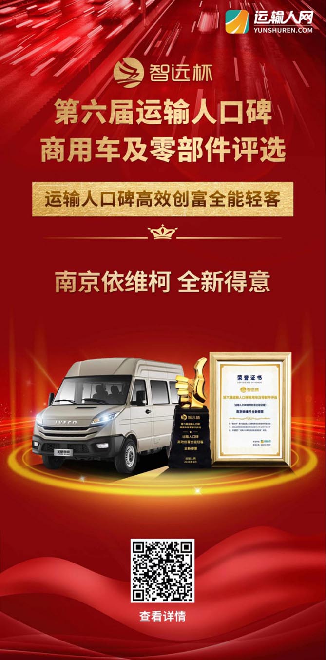 2024年1月,行業矚目的“智遠杯”第六屆運輸人口碑商用車及零部件評選活動隆重舉辦,依維柯得意憑借可靠品質和出色口碑脫穎而出,一舉摘得““口碑高效創富全能輕客”獎項!
