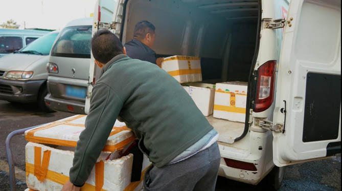“行啊,今天應(yīng)該輕松點(diǎn),你別說(shuō)十一高峰期是真猛,每天1噸多的螃蟹連續(xù)送7天,得虧我那車貨廂有7個(gè)方了,每天一趟就運(yùn)完了,不然我今天鐵定是扛不住了。”喻師傅回應(yīng)道,手上也忙活不停,麻利地清貨、搬蟹,不一會(huì)的工夫,兩人就合力將螃蟹都裝進(jìn)了車廂。確認(rèn)泡沫箱都擺放得穩(wěn)穩(wěn)當(dāng)當(dāng)之后,喻師傅關(guān)上了后車廂門,連上藍(lán)牙、選好歌曲,哼著歌,迎著燦爛的朝陽(yáng),向各大送貨點(diǎn)駛?cè)ァ?/span>