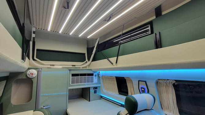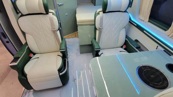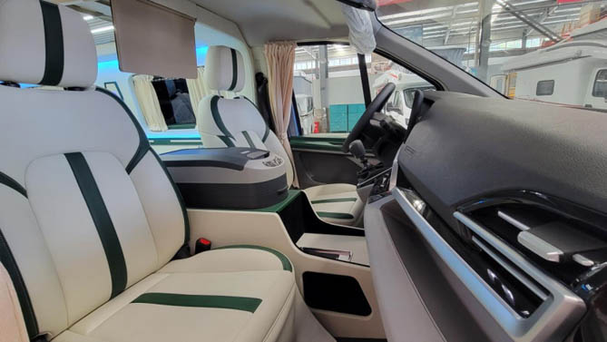 來到車身內部,一下就被它的溫馨和舒適所打動。可布局4座商務座椅組合或6人對卡座版,空間利用率高,坐乘舒適安全;四柱電動硬升頂結構,在保溫隔熱與便利性同時完善了整車的防水性,只需通過一鍵升頂,內高可以達到1930mm,方便駐車狀態的起居活動空間。