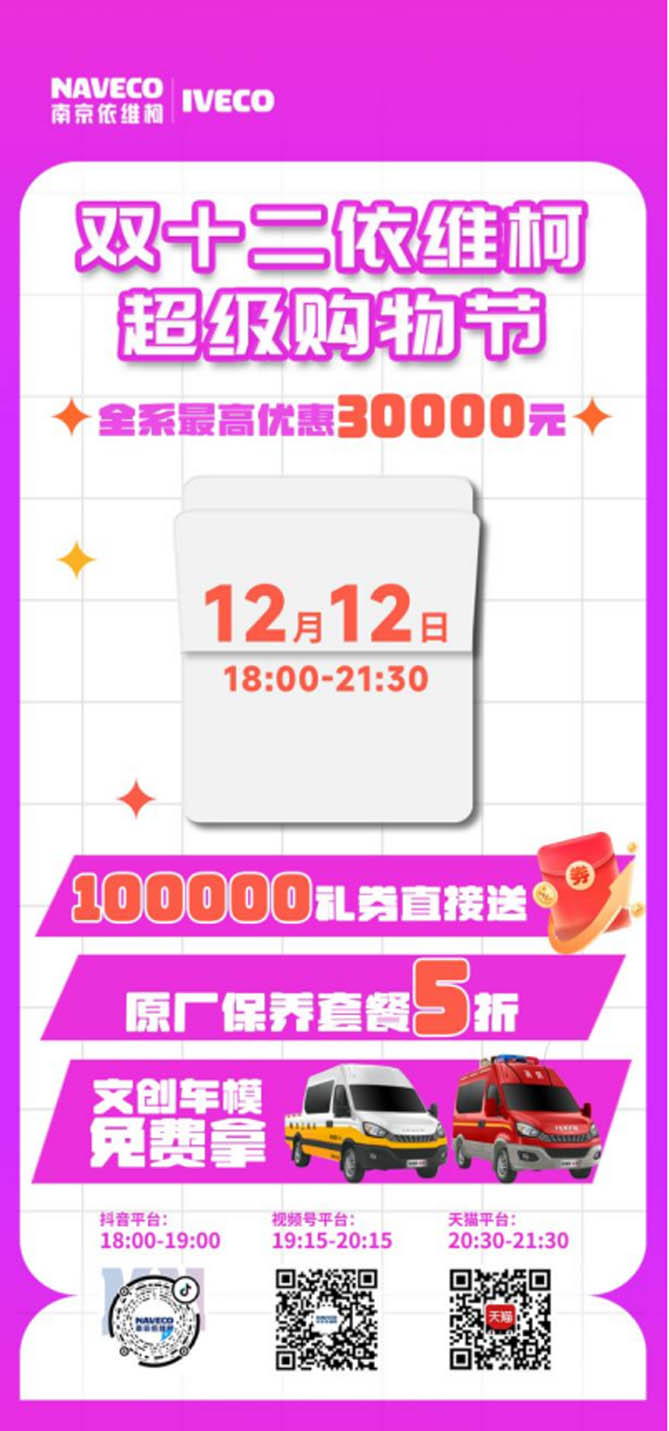 當然,除了年末購車福利優惠外,雙十二更是優惠福利滿滿。在雙十二當天18:00 - 21:30,用戶還可以鎖定南京依維柯官方抖音、視頻號、天貓直播間,跟著金牌主播在線看車,參與直播間口令抽獎活動,就有機會獲得1000元大額購車券、車模文創周邊等更多購車福利(具體福利以官方發布為準)。直播間購車福利多多,不容錯過!