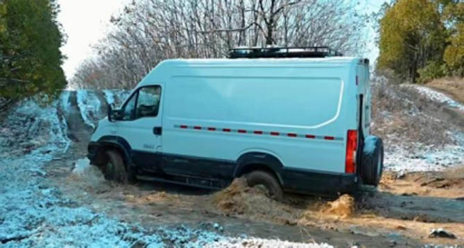 淤泥濕滑路段,車輪容易在泥濘中“趴窩”,進退兩難。依維柯歐霸·山海、歐霸·雷霆緩緩駛入這片泥沼,全時四驅系統悄然發力,三把差速鎖迅速介入,將動力均勻分配到每個車輪,車輪穩穩咬合泥漿,在打滑瞬間迅速鎖止空轉輪,期間車身依舊保持平穩。