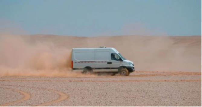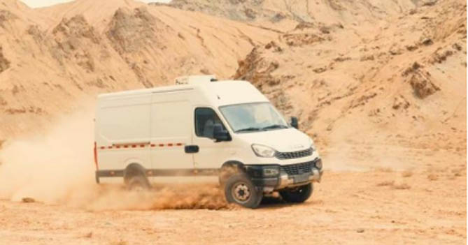 來到格爾木,依維柯歐霸·山海、歐霸·雷霆的表現著實令人驚喜。3.0T發動機,功率可達132KW(179馬力),輸出扭矩高達430N·m,動力強勁,為車輛在沙地中提供了源源不斷的推進力。在沙地行駛時,全時四驅系統能夠根據車輪的附著力狀況,結合前橋、中央、后橋三把差速鎖,精準地將動力分配到各個車輪,讓車輪始終保持良好的抓地力,避免出現陷入沙地空轉的情況,穩步前進。