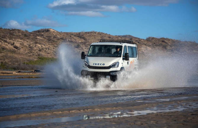 在松軟的沙地,由于沙地無法提供足夠堅實的支撐,車輪很難抓地,極易陷入沙中,常常出現空轉現象,還可能因頻繁摩擦顛簸造成零部件的損壞。然而,這些困難在依維柯歐霸·山海、歐霸·雷霆面前,并非不可克服。