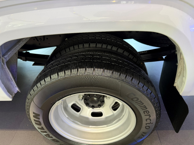 車輛采用前通風(fēng)盤后盤的制動(dòng)形式,雙胎車型的前后輪均為固特異195/75R16LT型輪胎。