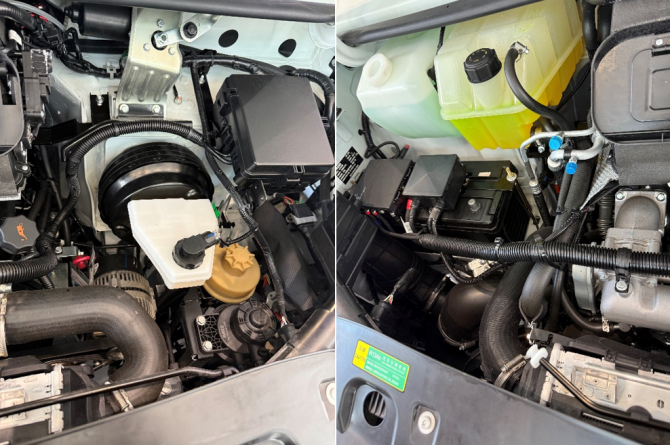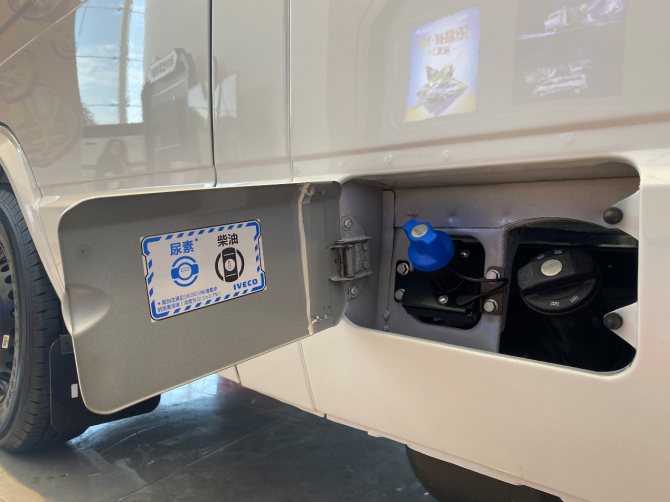 加油口在車輛的左側(cè),柴油和尿素箱蓋用黑色與藍(lán)色加以區(qū)分。