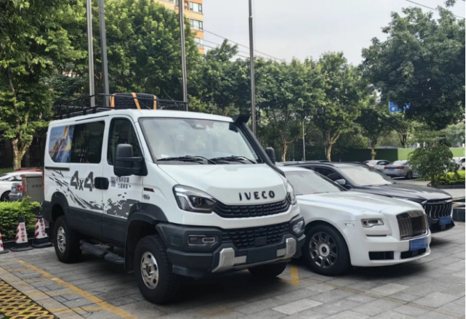 酒店門口的停車場上,依維柯歐霸·山海高大威猛的體型,讓它成為眾人目光的焦點。