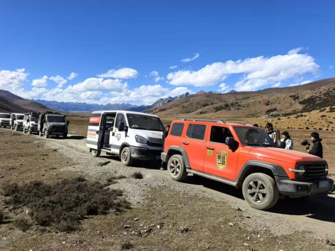 當車輛駛過塔公草原的高原土路,全時四驅系統與全地形輪胎穩抓地面,氮氣減震器過濾顛簸,車身始終保持穩健姿態;加裝涉水喉的車輛,穿越涉水淺灘毫無波瀾,輕松通過。
