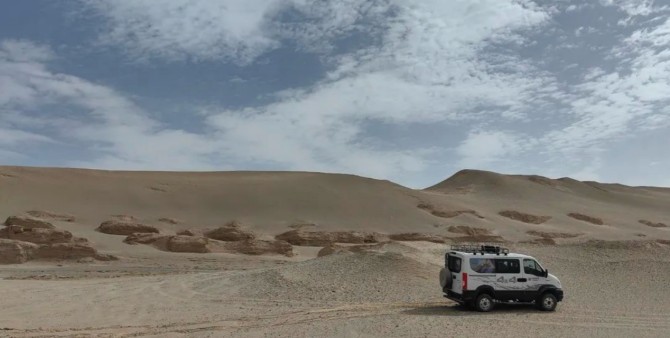 “別問我為什么,干就完了!”小馬哥猛踩油門,車尾揚起的塵龍陡然拔高,車影如魚躍龍門掠過沙丘,沙粒似火星濺射,在夕陽的余暉里閃爍,轉(zhuǎn)瞬又被風(fēng)卷揉進(jìn)塵幕,化為這狂野畫卷中的點睛之筆。“就這個feel 倍兒爽!”他滿意地夸贊道:“玩越野差不多有近十年了,開過的越野車差不多也有十多款,綜合來看,最適合我的還是依維柯的這輛歐霸·山海。全時四驅(qū)三把鎖,高適應(yīng)性的全地形輪胎,高強度鋼的車身底盤,這些都非常給力,而我最滿意就是一個‘大’字。大空間,差不多得有13m3,可以放很多東西,睡一覺都沒問題,油箱也夠大,80L+20L續(xù)航持久,深入無人區(qū)也完全不慌,再就是發(fā)動機這一塊了,F(xiàn)1C3.0T的強大動力可真不是蓋的,179的馬力和430的扭矩,30度斜坡照樣一腳油門就上去了。”戈壁深處,機械的轟鳴與自然的寂靜達(dá)成了奇妙的平衡,歐霸·山海是闖入者,亦是這荒原交響曲的演奏者。它用速度撕裂寂靜,用塵煙書寫軌跡,最終又與晚霞、沙丘、風(fēng)一起,熔鑄成戈壁永恒的蒼茫與壯美。