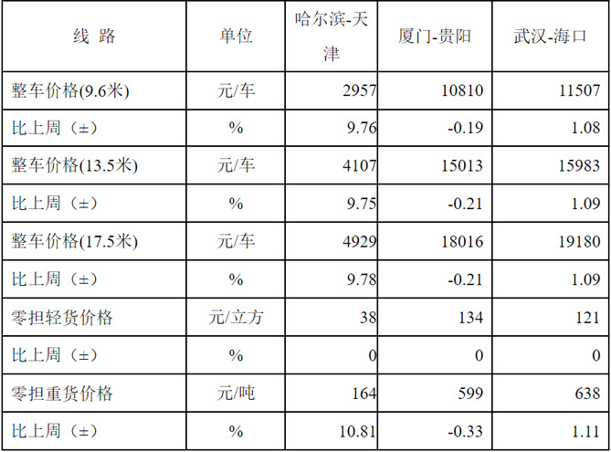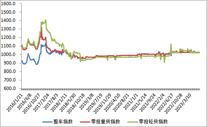 分車型看,各車型指數環比略微回升。其中,整車指數為1026.13點,比上周回升0.01%;零擔輕貨指數為1020.21點,比上周回升0.03%;零擔重貨指數為1025.21點,比上周回升0.02%。