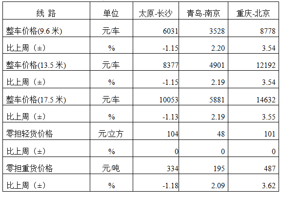 表1 本周部分線路平均價格及環(huán)比情況對比