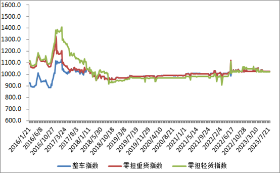 分車型看,各車型指數(shù)環(huán)比略微回升。其中,整車指數(shù)為1027.02點,比上周回升0.09%;零擔(dān)輕貨指數(shù)為1020.17點,比上周回升0.01%;零擔(dān)重貨指數(shù)為1026.09點,比上周回升0.09%。