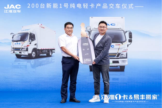 江淮1卡將“新能1號”純電輕卡金鑰匙交付易豐搬家