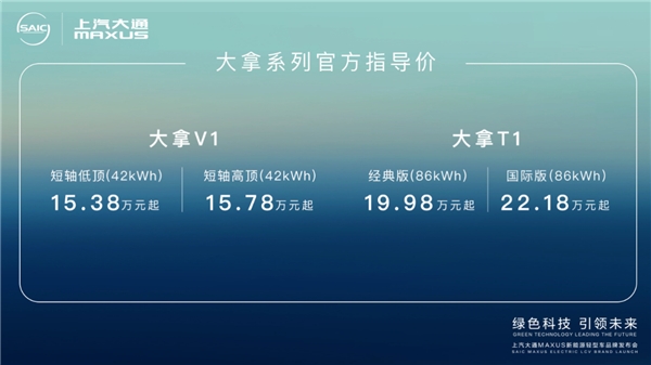 秉承上汽大通MAXUS智能、高效、綠色的品牌DNA,在大拿T1、V1之后,大拿品牌每年還將推出多款車型, 未來2年內,大拿還將推出10款全新新能源車型,全球新能源輕型車新時代已到來,上汽大通MAXUS立足多年的技術積淀,全新品牌、全新平臺、全新車型“大招齊放”,為“全球新能源輕型車領導者”再添有力證明。