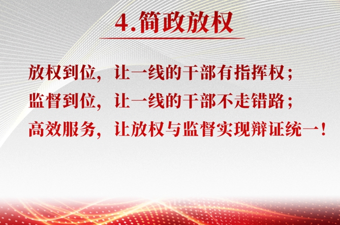 24個字其四,簡政放權。主要讓一線干部有指揮權,當然,這背后不能缺少必要的監督和高效服務,最終要實現放權和監督的辯證統一。這一點和國家層面的管放服一致,足以看出在發展路線上,譚旭光有條主線,那就是跟著國家政策路線節奏走。正是在他的帶領下,一線的干部才不會走錯路。
