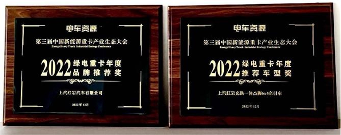 上汽紅巖榮獲2022綠電重卡“年度品牌推薦獎”及“年度推薦車型獎”