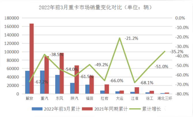 2022年的重卡市場(chǎng),在“凜冬將至”的預(yù)言中艱難起跑,受全球經(jīng)濟(jì)下行、俄烏沖突升級(jí)、國(guó)內(nèi)疫情多點(diǎn)散發(fā)、燃油價(jià)格持續(xù)飆升以及車多貨少等不利因素疊加影響,一季度國(guó)內(nèi)重卡累計(jì)銷量為23.2萬(wàn)輛,同比去年的53.1萬(wàn)輛,下降了56.3%。