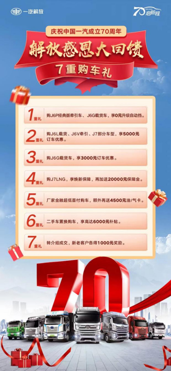 為獻禮中國一汽70周年華誕,感恩用戶厚愛,一汽解放近期特別推出包括超低首付購車、二手車置換優惠等在內的“七重禮”回饋廣大卡友;同時,解放品牌共計70輛“特惠車”即將在線上搶購;近期到店用戶,還將有機會享70周年“進店禮”……諸多精彩內容就在當下,不容錯過!