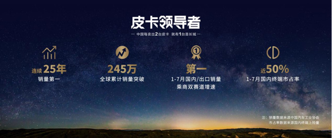 四年來,長城炮持續(xù)發(fā)力乘用休閑、時尚商用兩大品類,引領(lǐng)皮卡品類創(chuàng)新、皮卡文化發(fā)展和用戶共創(chuàng)。目前,長城皮卡已連續(xù)25年銷量第一,全球累計銷量突破245萬。今年1-7月長城皮卡國內(nèi)終端市占率近50%,中國每賣出兩臺皮卡,就有一臺是長城。長城炮已累計35個月銷量過萬,蟬聯(lián)皮卡銷量冠軍。