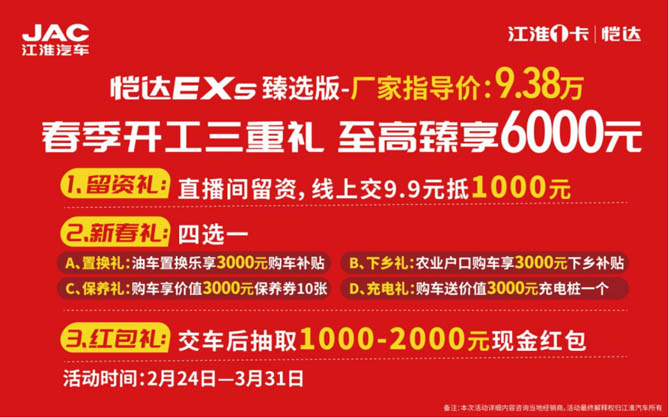 愷達(dá)EX5臻選版采用線上直銷模式,全網(wǎng)統(tǒng)一價,最大程度讓利用戶,讓您買得省!2024年2月24日-3月31日,參與活動領(lǐng)取春季開工三重禮,將新車開回家!