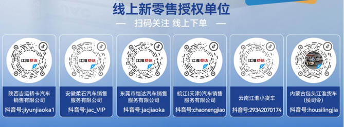 打開抖音掃碼關(guān)注或搜索以下任意一家授權(quán)單位即可快速下單。下單后,購車流程透明、速度更快。江淮1卡會將車輛運(yùn)輸至您所在城市,并由當(dāng)?shù)亟?卡經(jīng)銷商聯(lián)系您交尾款、提車。線上下單、線下包郵到家,買車方便省心!