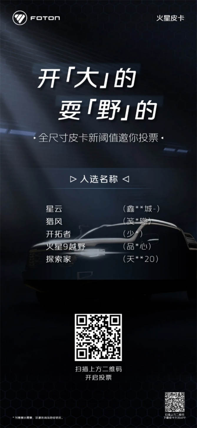 7月25日-8月5日,火星皮卡在皮卡生活APP和官方微信公眾號平臺發起命名評選,掃描下方二維碼不僅可以為自己心儀的命名打call,更有機會獲得由官方送出的神秘大獎!