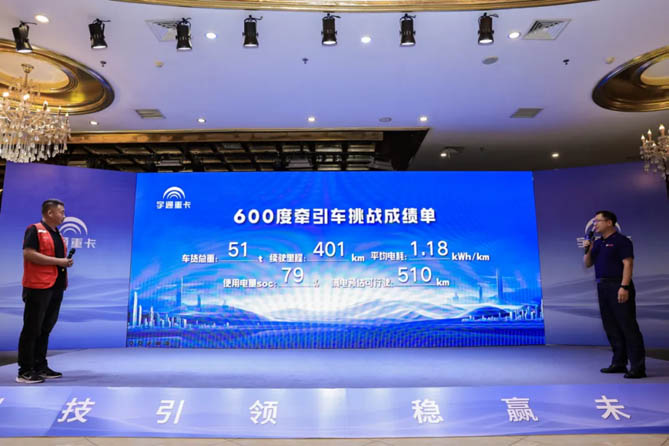 在發(fā)布會(huì)之前,宇通重卡600度牽引車進(jìn)行了一次信心十足的實(shí)況續(xù)航挑戰(zhàn)。車輛在實(shí)況運(yùn)輸場景下滿載51噸全程歷時(shí)10小時(shí)往返廣西賀州、梧州兩地,憑借一次充電輕松長續(xù)航的實(shí)力,最終以1.18度/公里的電耗表現(xiàn)完成401公里長續(xù)航挑戰(zhàn),車輛使用SCO值為79%,滿電預(yù)估可行駛最長里程為510公里。真實(shí)場景、真測挑戰(zhàn)、現(xiàn)場公布成績,不僅展現(xiàn)出宇通600度牽引車的硬核實(shí)力,更展現(xiàn)出宇通重卡說到做到的價(jià)值承諾。